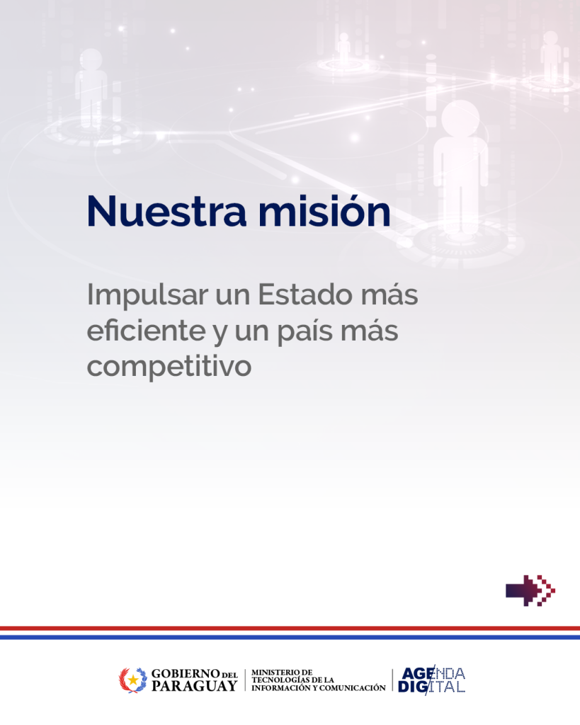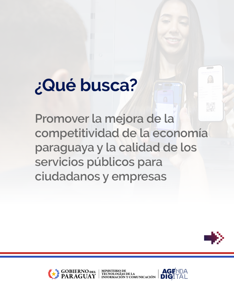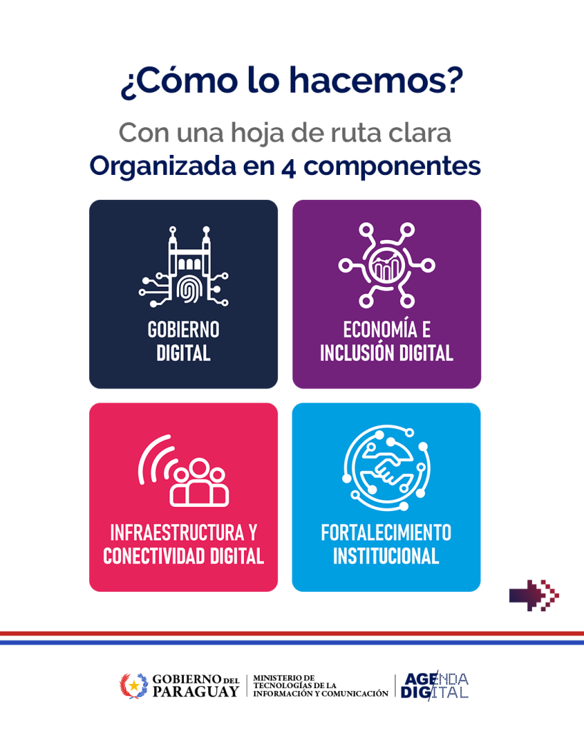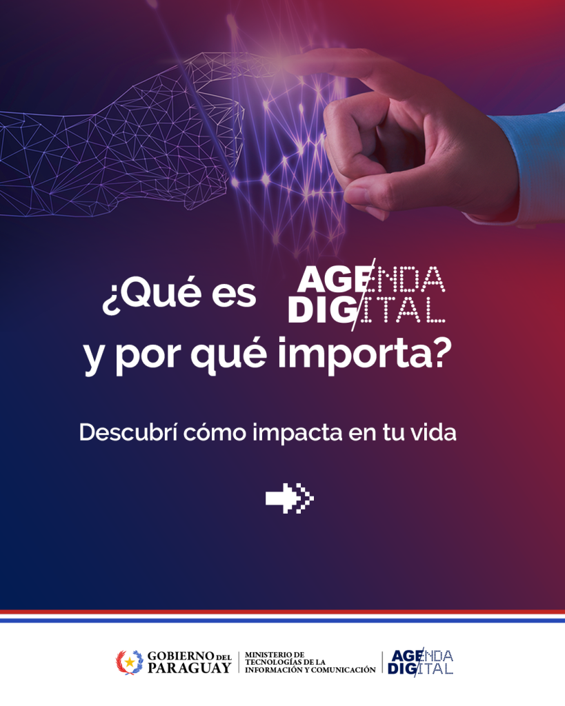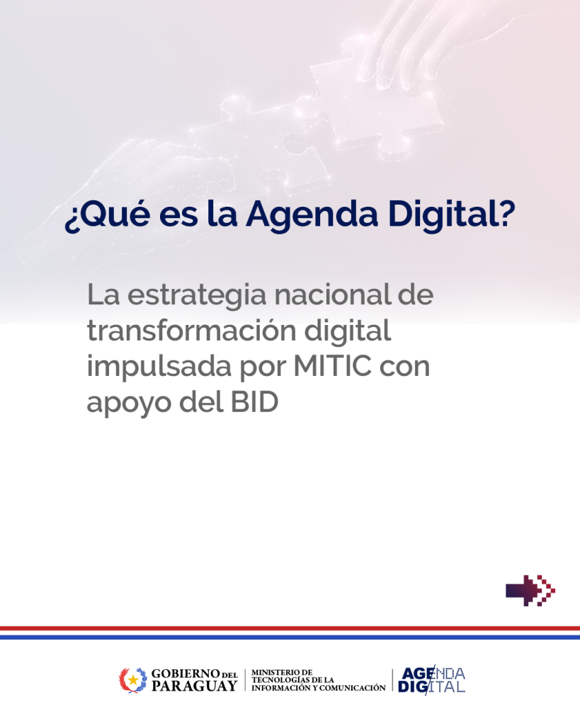 Impulsada por el Ministerio de Tecnologías de la Información y Comunicación (MITIC), con financiamiento del Banco Interamericano de Desarrollo (BID), la Agenda Digital tiene como objetivo mejorar la calidad de los servicios públicos y fortalecer la competitividad de la economía paraguaya. A través de este programa, la transformación digital del país se organiza en cuatro componentes clave: Gobierno Digital, Economía e Inclusión Digital, Conectividad Digital y Fortalecimiento Institucional.