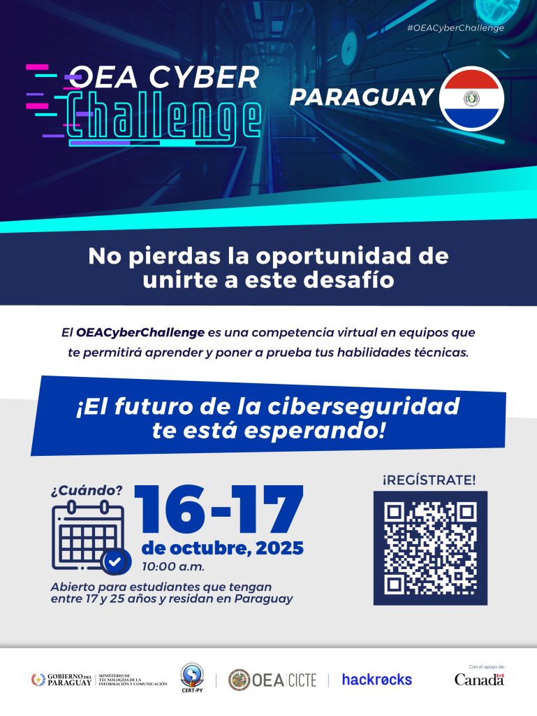 Las inscripciones no tienen costo y se podrán realizar de forma individual o en equipos de hasta tres integrantes; los interesados pueden postularse a través del enlace oea-cyberchallenge-paraguay.hackrocks.com/.