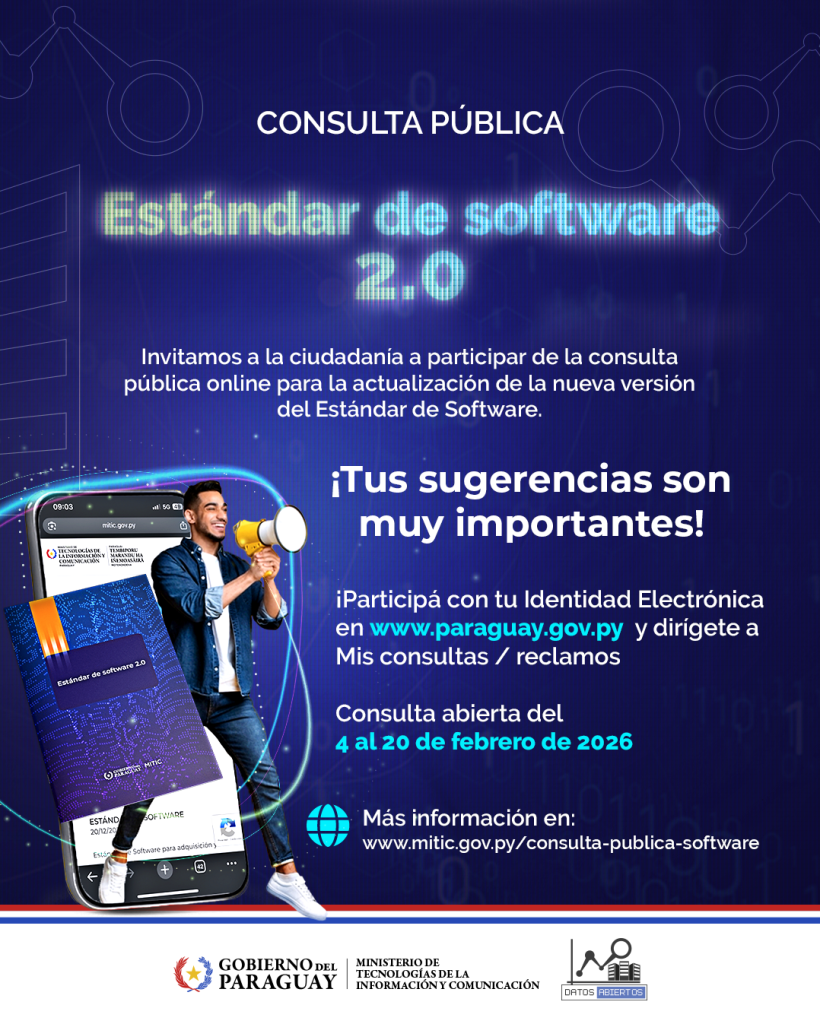 El Ministerio de Tecnologías de la Información y Comunicación (MITIC) abrió este miércoles 4 de febrero el periodo de consulta pública en línea para la actualización del Estándar de Software – Versión 2.0. La ciudadanía, así como organizaciones, instituciones y proveedores, podrá participar hasta el 20 de febrero, aportando observaciones y propuestas. El único canal habilitado para la recepción de sugerencias es la web del Portal Paraguay, a la que se accede mediante la Identidad Electrónica.
