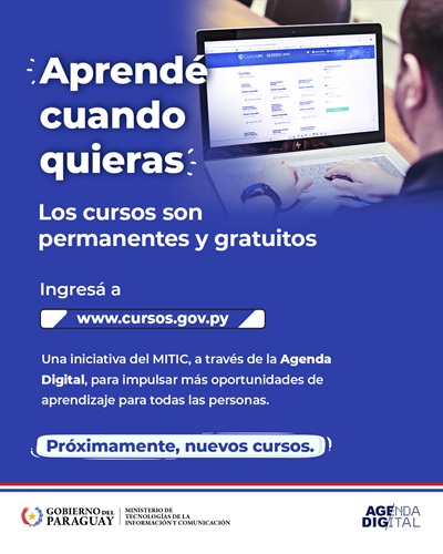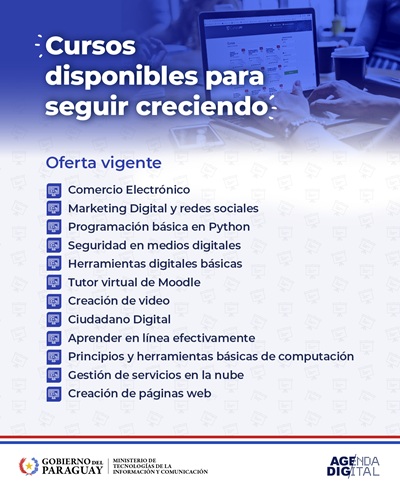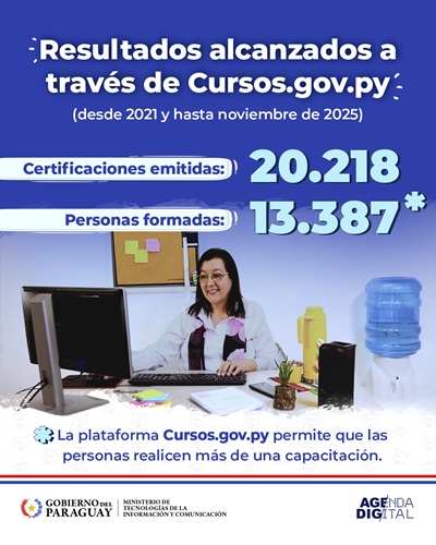 El Ministerio de Tecnologías de la Información y Comunicación (MITIC) emitió más de 20.000 certificados de cursos gratuitos, dictados a través de su campus virtual, cuya oferta académica se encuentra disponible en cursos.gov.py. La plataforma ofrece formación digital permanente, siendo los cursos con mayor demanda computación básica, comercio electrónico, marketing digital y programación básica en Python.