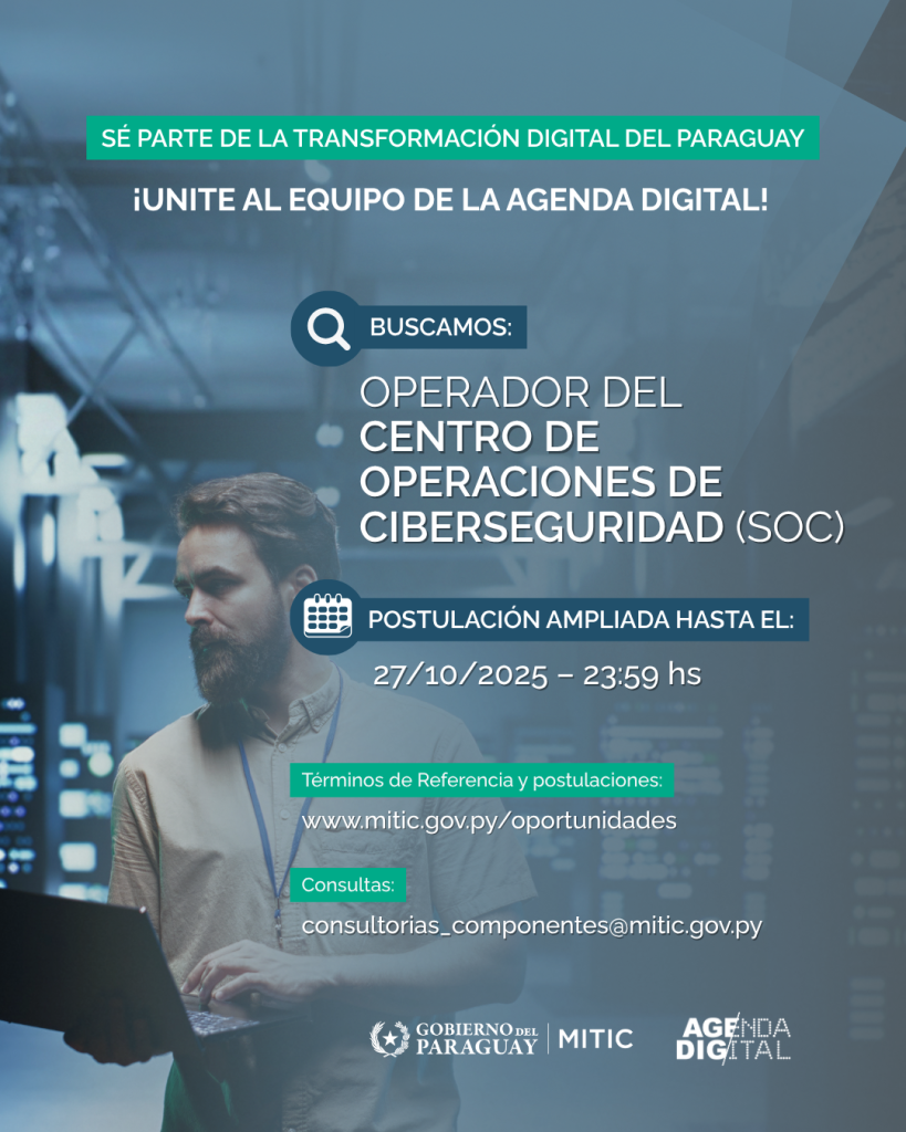 Objetivo de la consultoría: Realizar las tareas operativas en el Centro de Operaciones de Ciberseguridad (SOC) Gubernamental, incluyendo el monitoreo continuo de las infraestructuras tecnológicas estatales, la investigación de casos sospechosos, la gestión integral de las alertas de seguridad y el mantenimiento periódico de las herramientas y plataformas tecnológicas utilizadas.